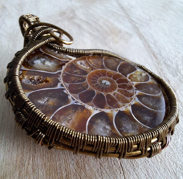 Een Ammoniet wire wrapped met vlechtontwerp. Deze grote Ammoniet heeft prachtige details: kleine stukjes geode > check de close up foto's!