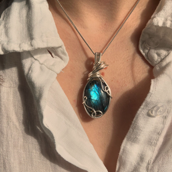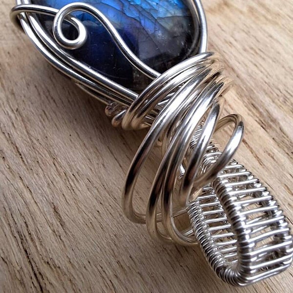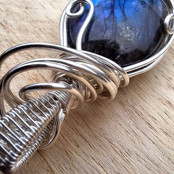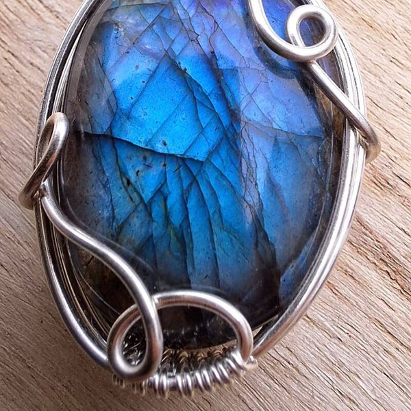 Deze wire wrapped Labradoriet heeft een ontzettend mooie blauwe flash!