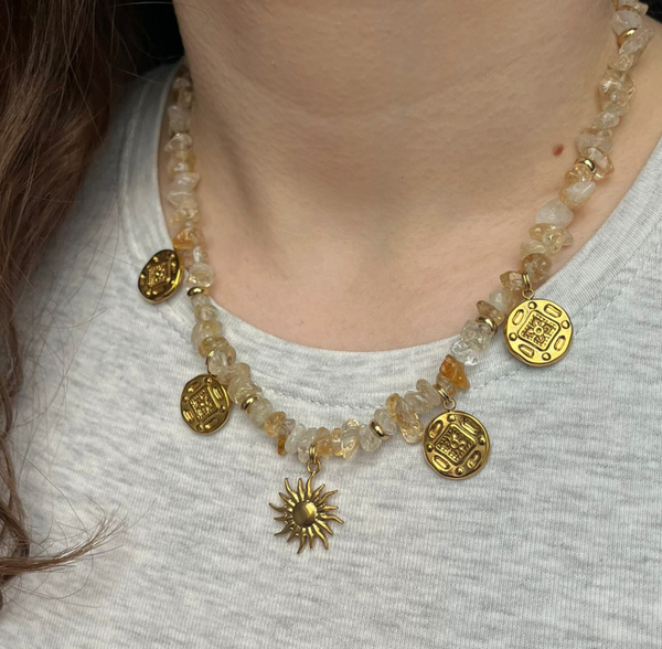 Deze edelsteenchip ketting is gemaakt met Citrien chips en heeft goudkleurige bedels (een zonbedel en 4 muntbedels).
