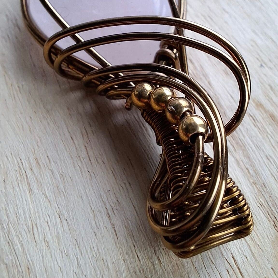 Rozenkwarts wire wrapped in klassiek model met vintage brons draad en 4 kleine kraaltjes verwerkt in de krul.
