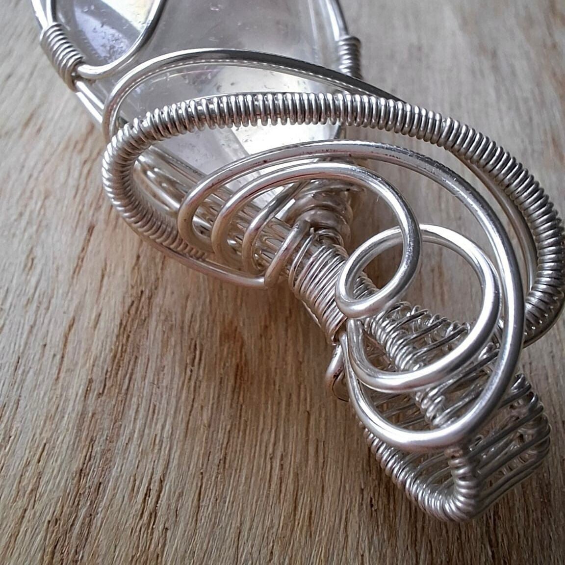 Heldere Angel Aura kwarts wire wrapped in sierlijk model met zilver kleur draad.