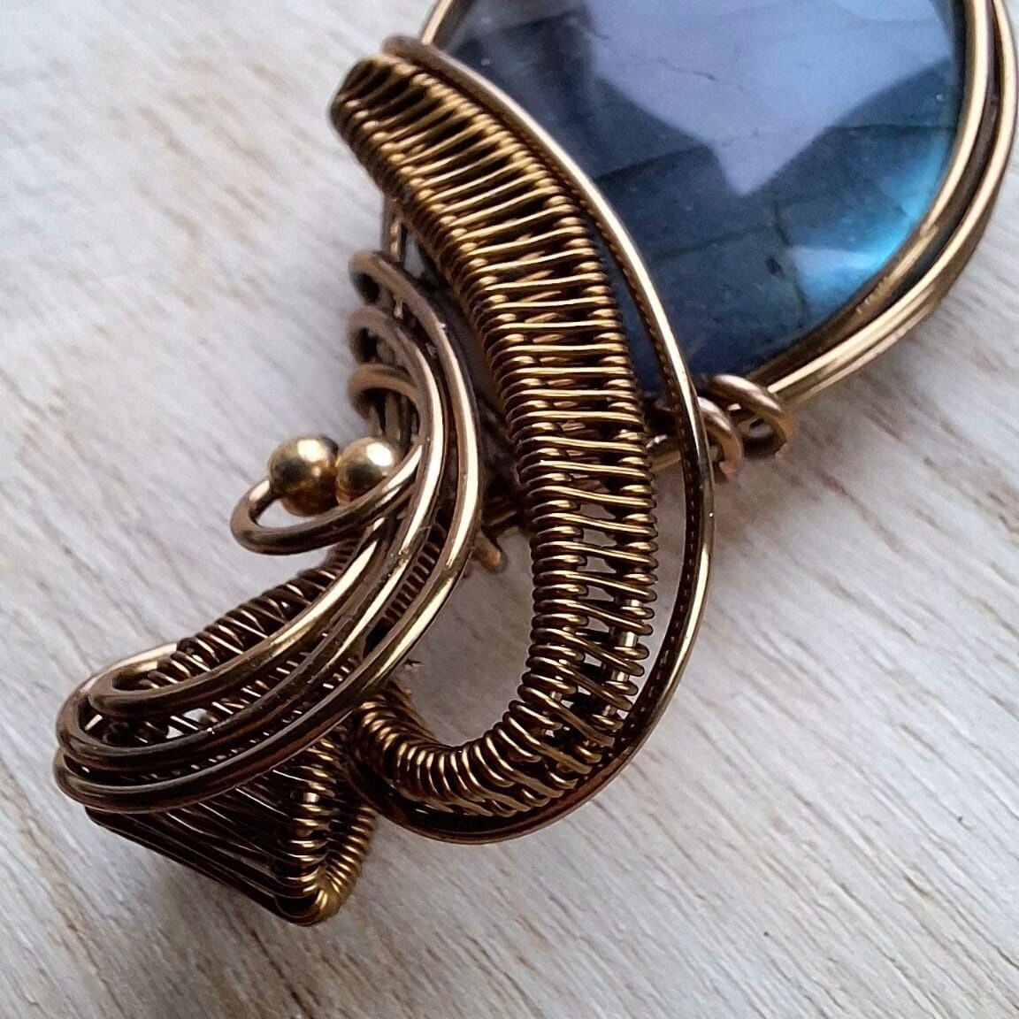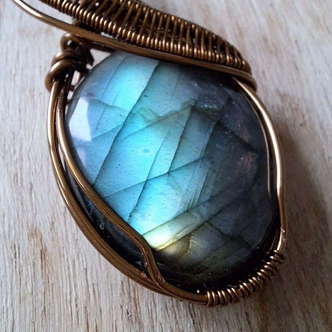 De labradoriet is gewikkeld in hoge kwaliteit ijzerdraad van BeadSmith (Wire Elements craft wire lijn). Het draad heeft een speciaal aanslag bestendig laagje (non tarnish); dit zorgt ervoor dat het draad minder snel verkleurd. Het sieraad bewaren in een sieradenbox helpt daarbij ook.