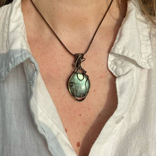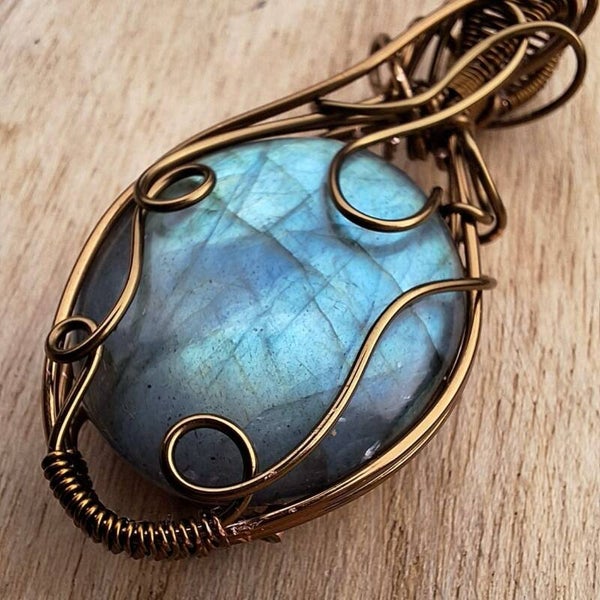 Deze Labradoriet is wire wrapped in prachtig krullerig ontwerp.