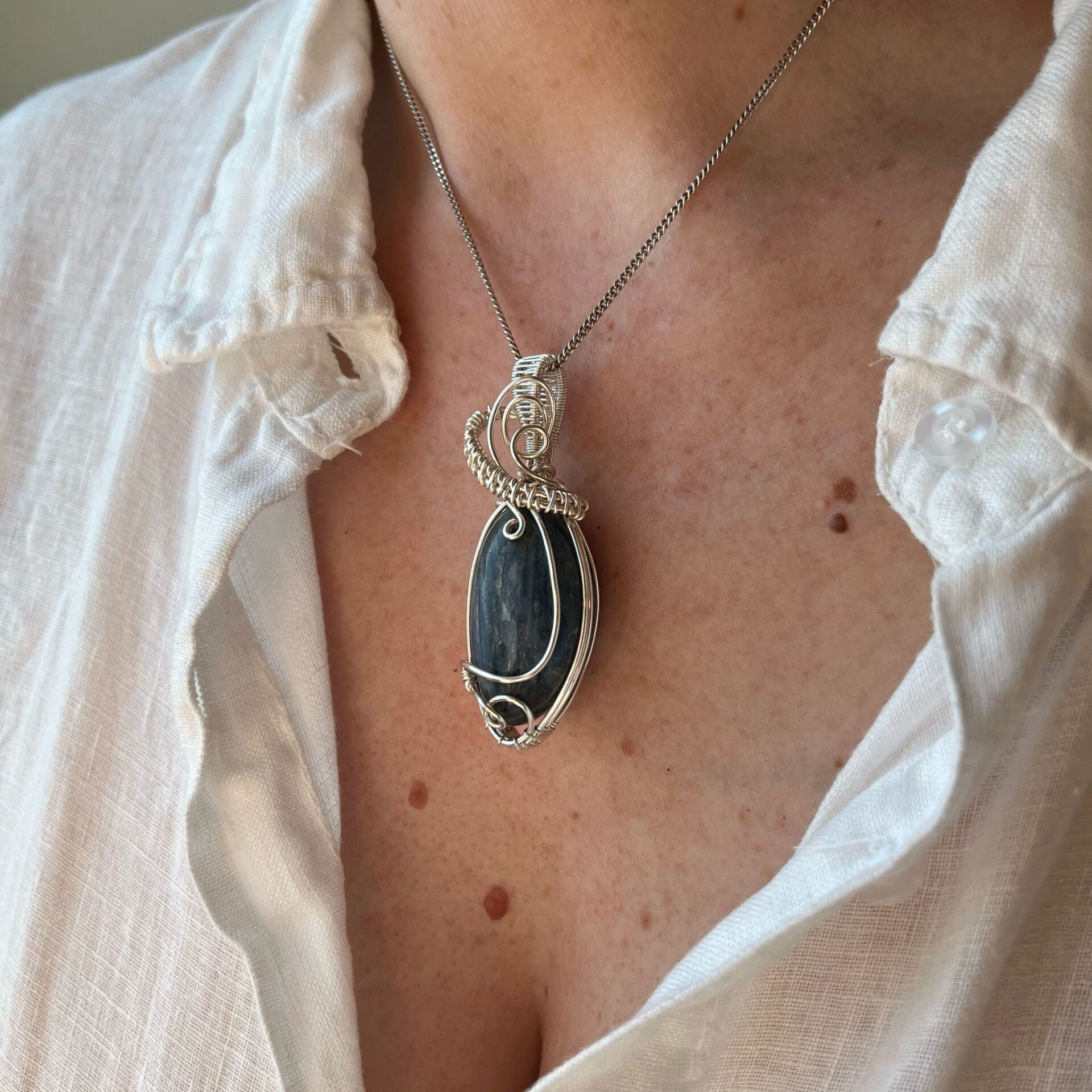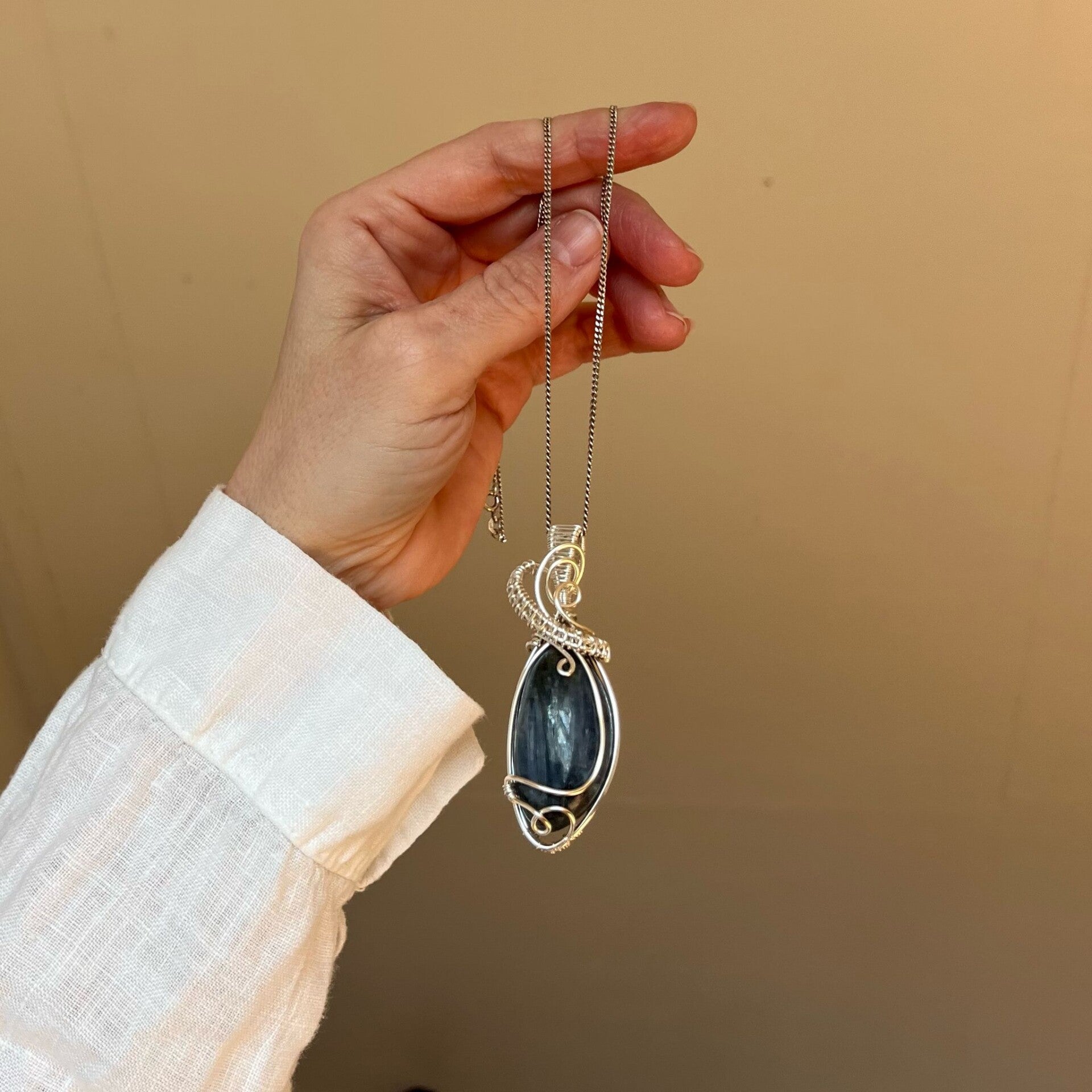 De Kyaniet is ter bescherming afgewerkt met een dun laagje hars, zodat deze langer mooi blijft. De steen is wire wrapped in sierlijk vlechtontwerp.