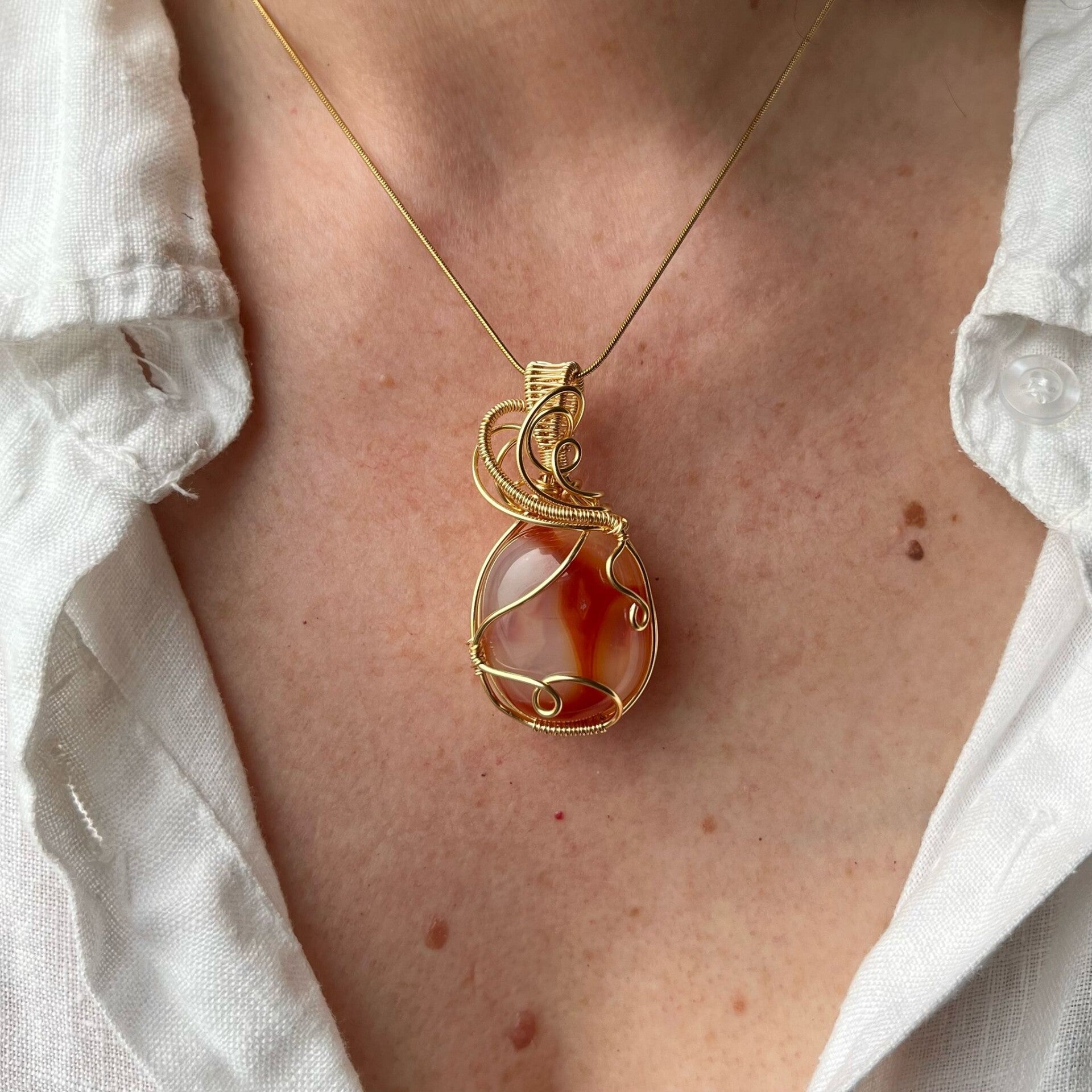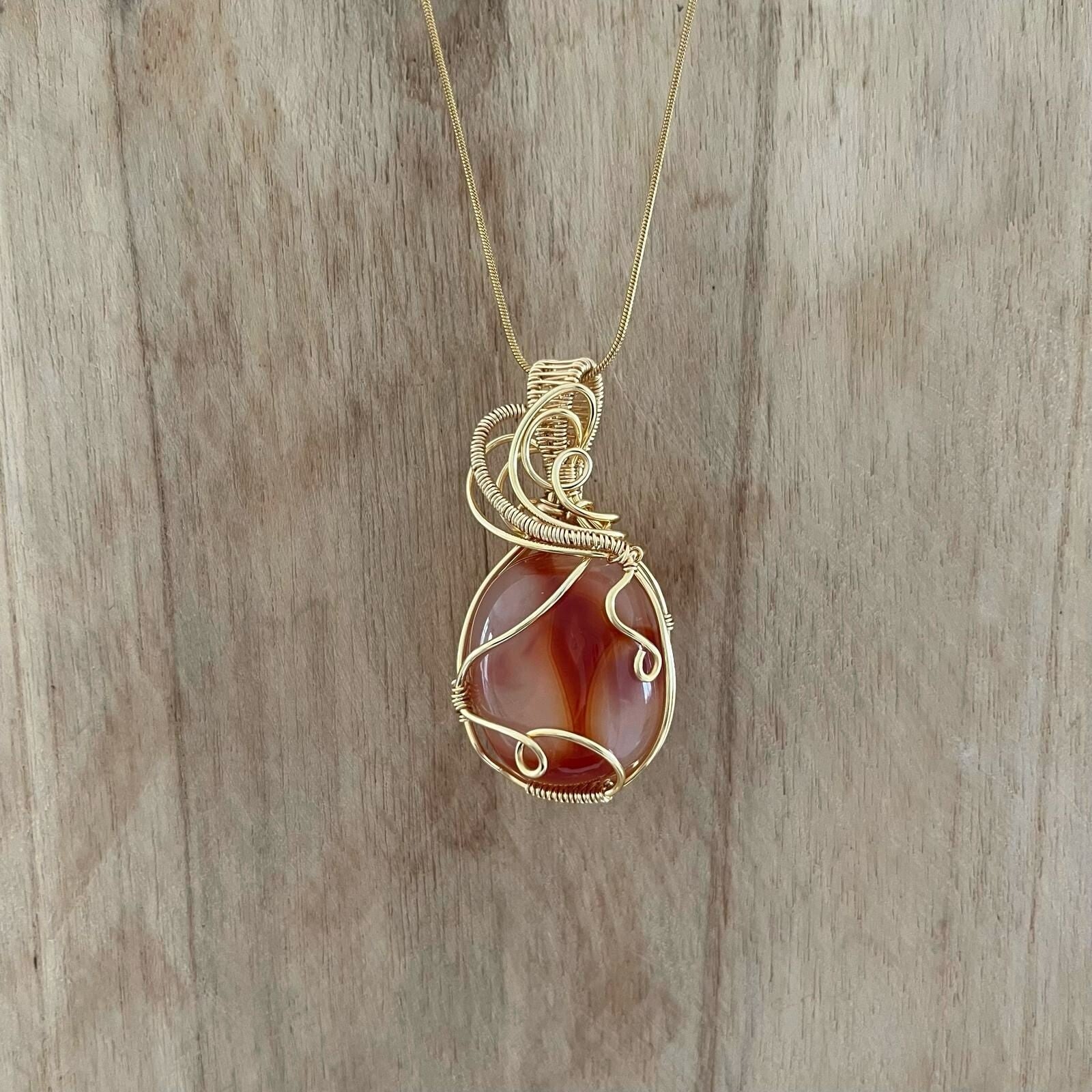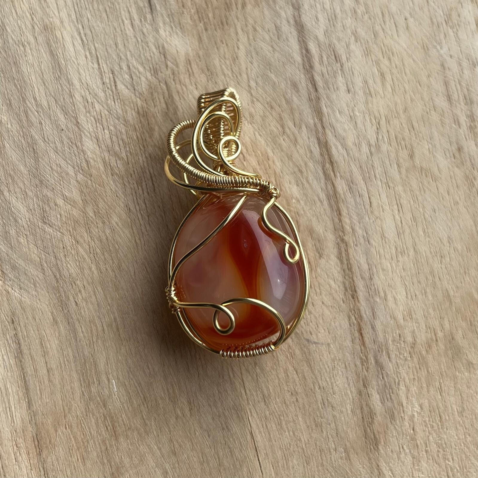 Een Carneool met prachtige levende kleuren wire wrapped in sierlijk krulontwerp.
