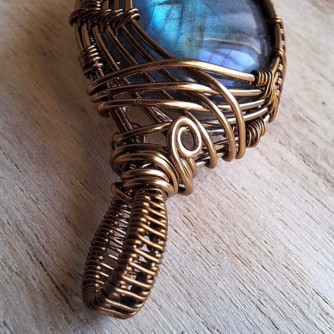 De labradoriet is gewikkeld in hoge kwaliteit ijzerdraad van BeadSmith (Wire Elements craft wire lijn). Het draad heeft een speciaal aanslag bestendig laagje (non tarnish); dit zorgt ervoor dat het draad minder snel verkleurd. Het sieraad bewaren in een sieradenbox helpt daarbij ook.