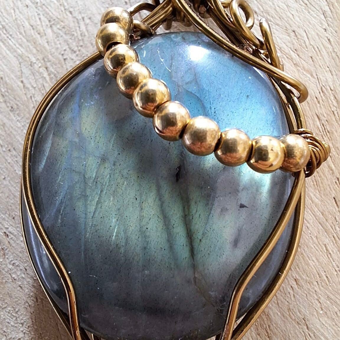 Labradoriet wire wrapped met 10 kraaltjes in het ontwerp.