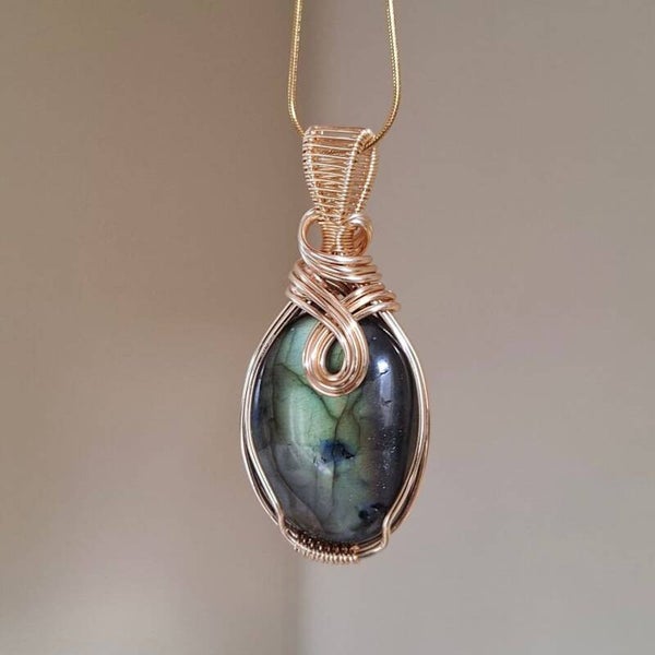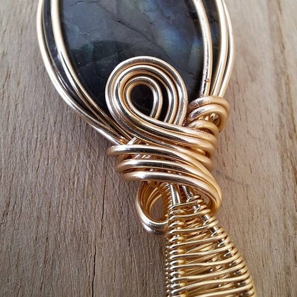 Labradoriet met prachtige gouden flash. Het wire wrapped ontwerp is bijna koninklijk.