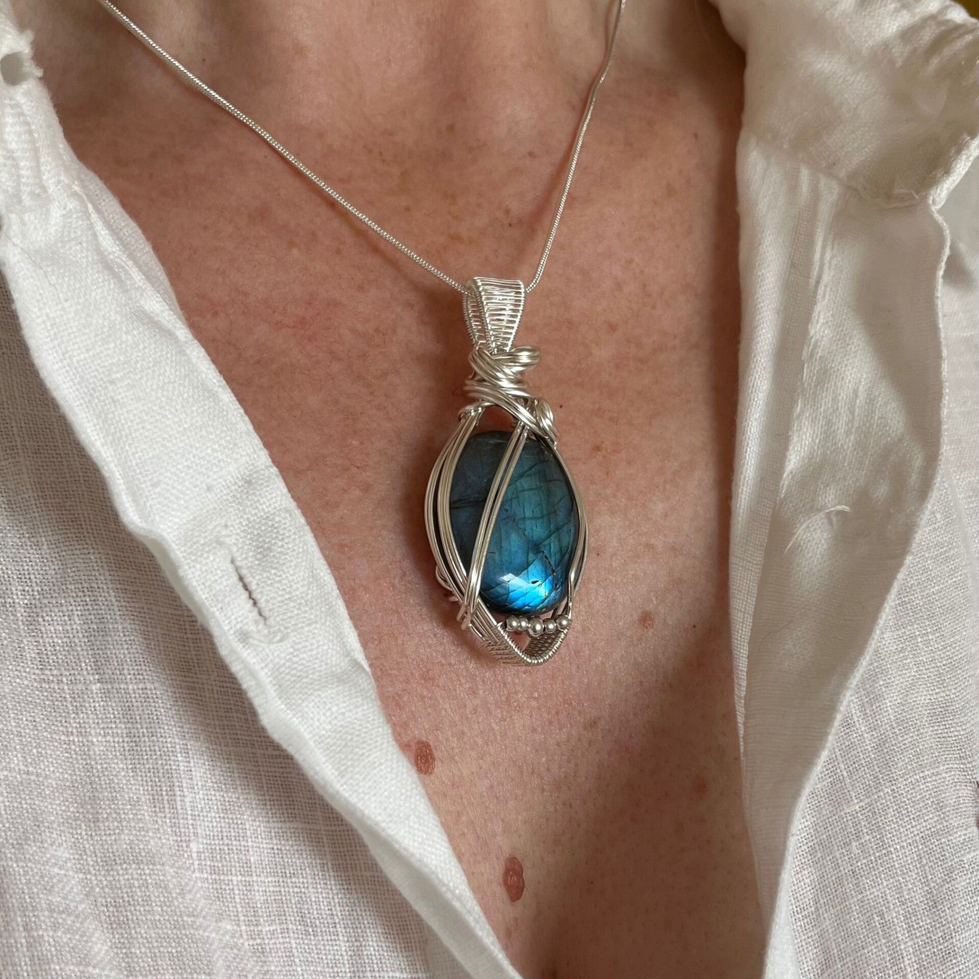 Deze labradoriet heeft een mooie blauwe flash en komt daardoor in het zilverkleurige wire heel goed tot z'n recht.