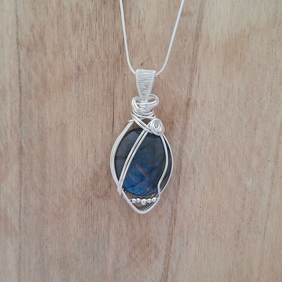 Labradoriet wire wrapped in sierlijk ontwerp.