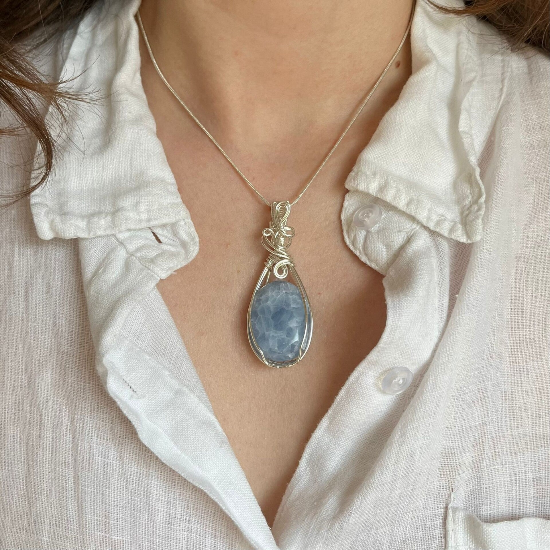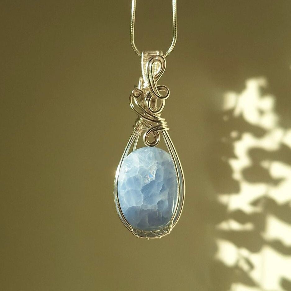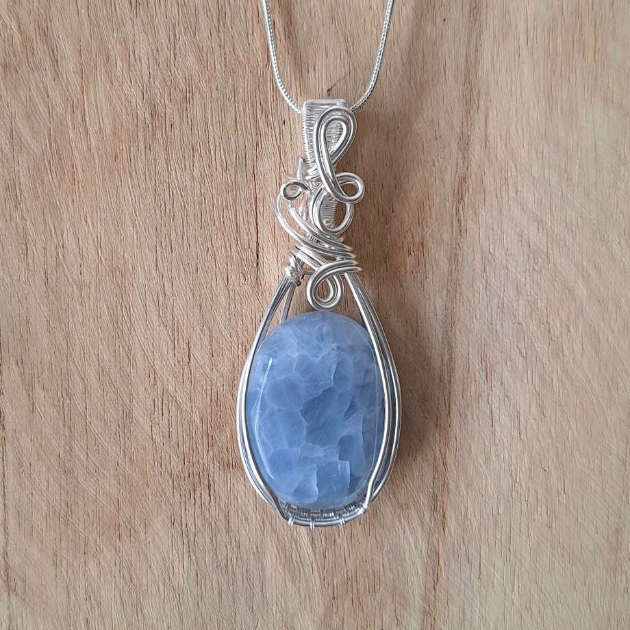 Prachtig blauwe Calciet wire wrapped tot sierlijke hanger.