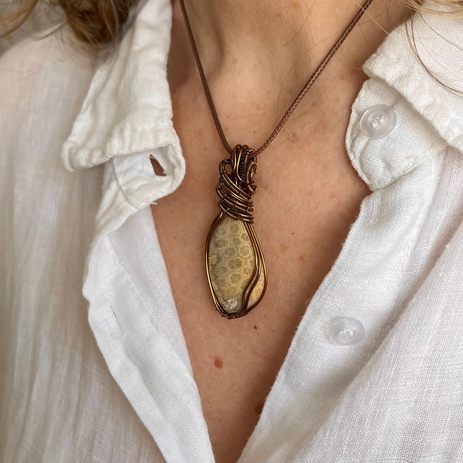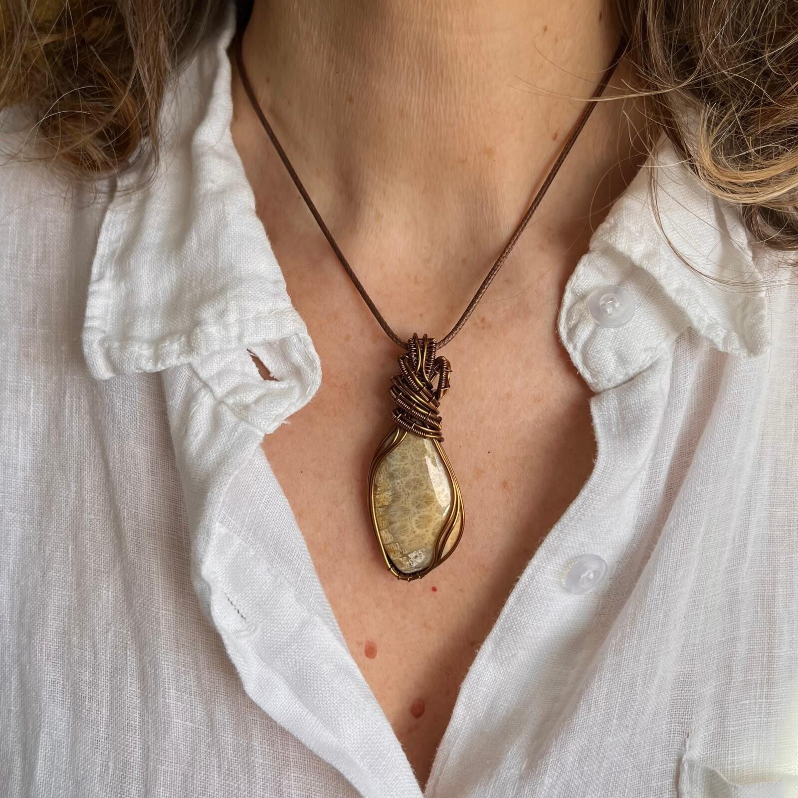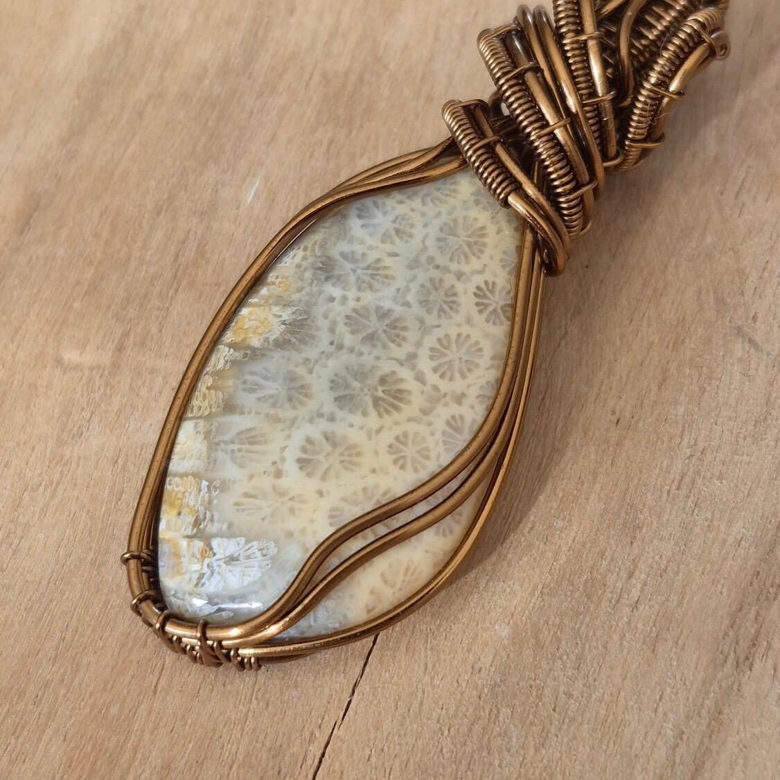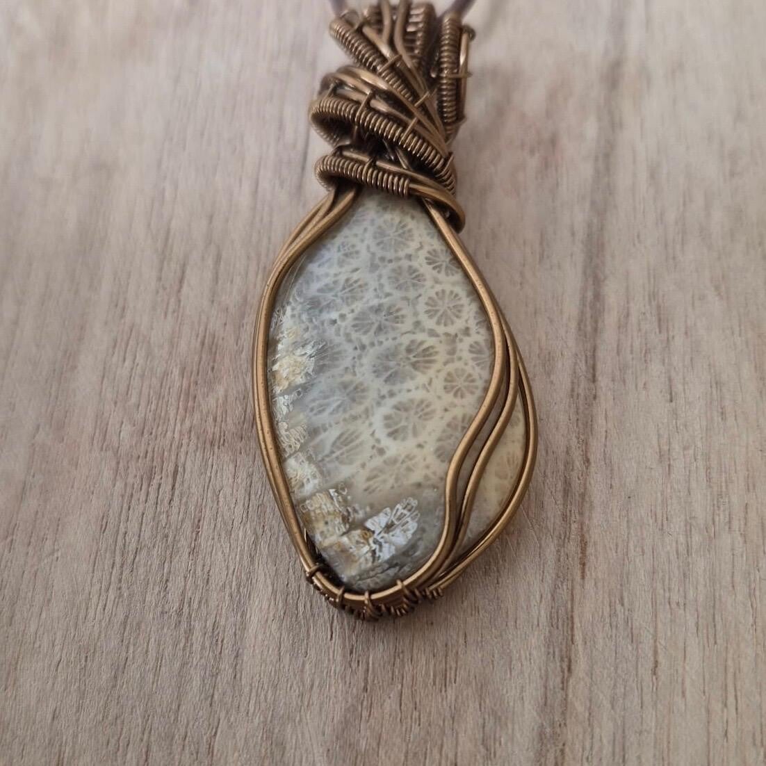 Deze Fossiel Koraal is wire wrapped in prachtig klassiek ontwerp.