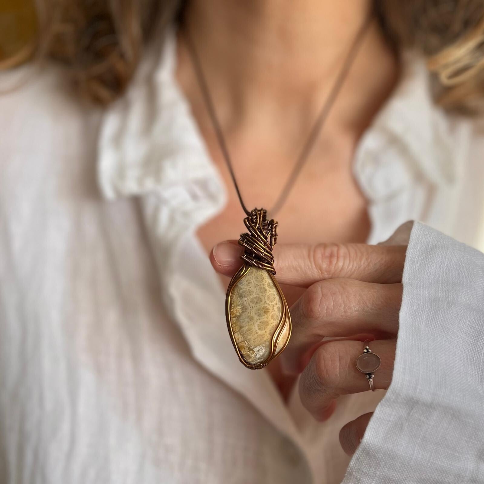 Wire wrapped Fossiel Koraal hanger (handgemaakt)